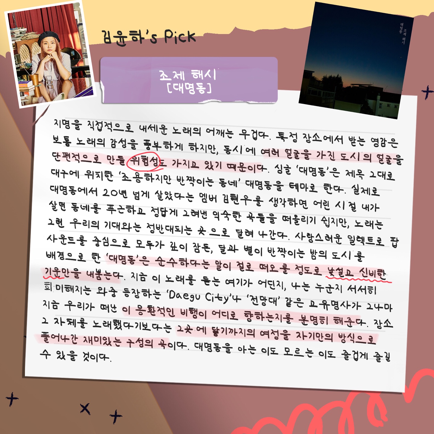 이 콘텐츠는 대구의 뮤지션과 그들의 음악을 소개하는 것으로 음악을 아주 좋아하는 애호가나 음악에 대한 견해를 객관적인 입장에서 말할 수 있는 의견가, 그리고 음악 장르의 평론가에게 들려주고 그들의 마음을 건드린 곡을 소개합니다.