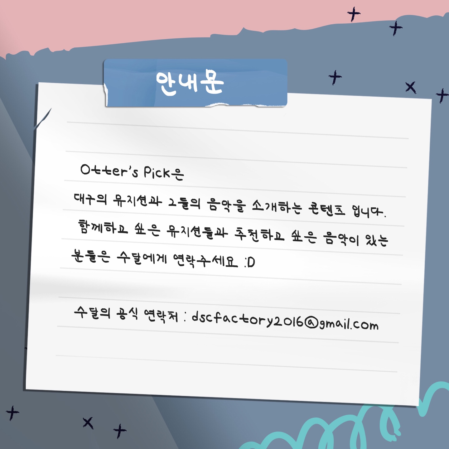 오터스맵의 구독자 분들 중에서도 함께 하고 싶은 뮤지션들과 추천하고 싶은 음악이 있다면 수달에게 알려주세요.