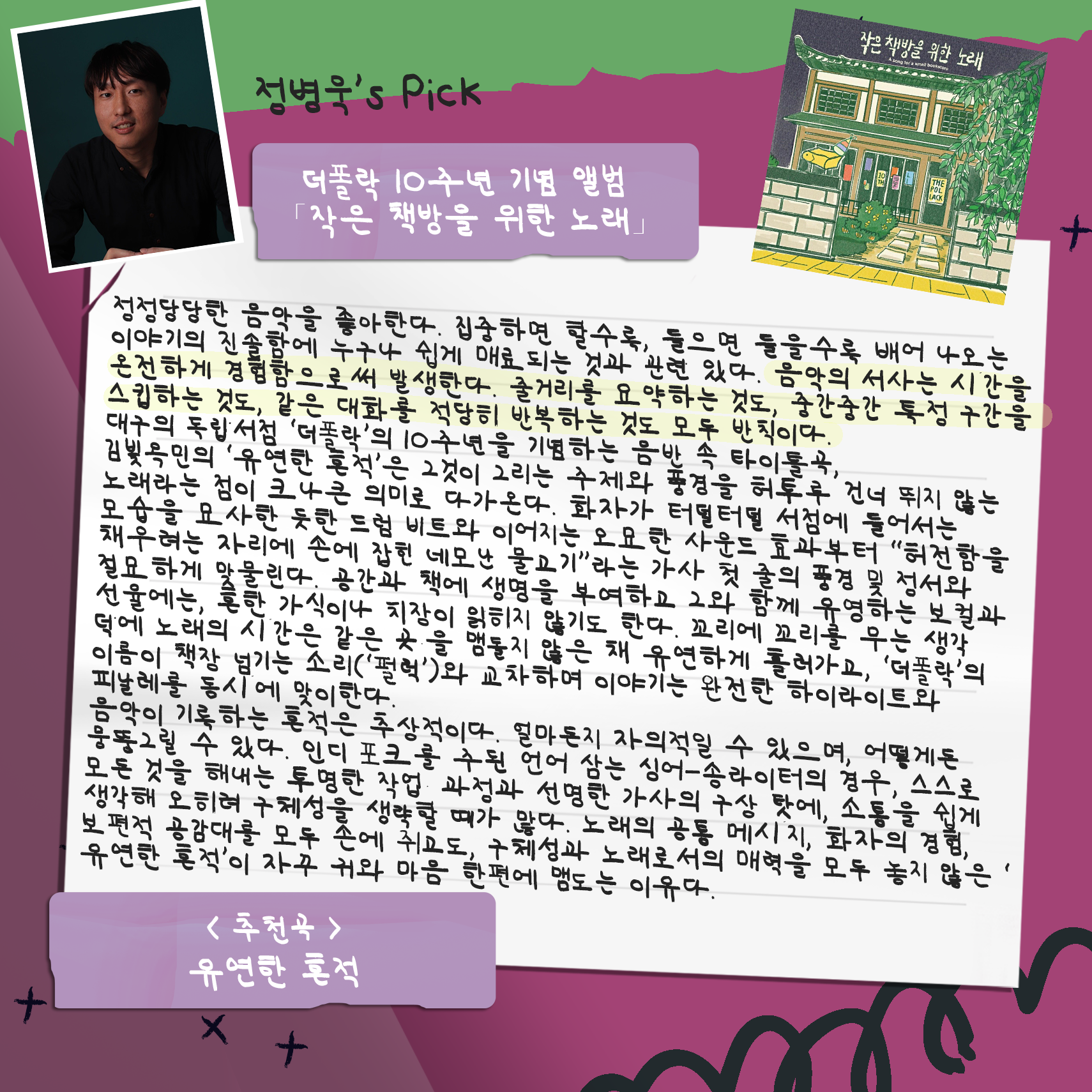 대중음악 의견가인 서정민갑 씨와, 평론가인 김윤하 씨, 정병욱 씨가 들어 보고 고른 추천곡들입니다.