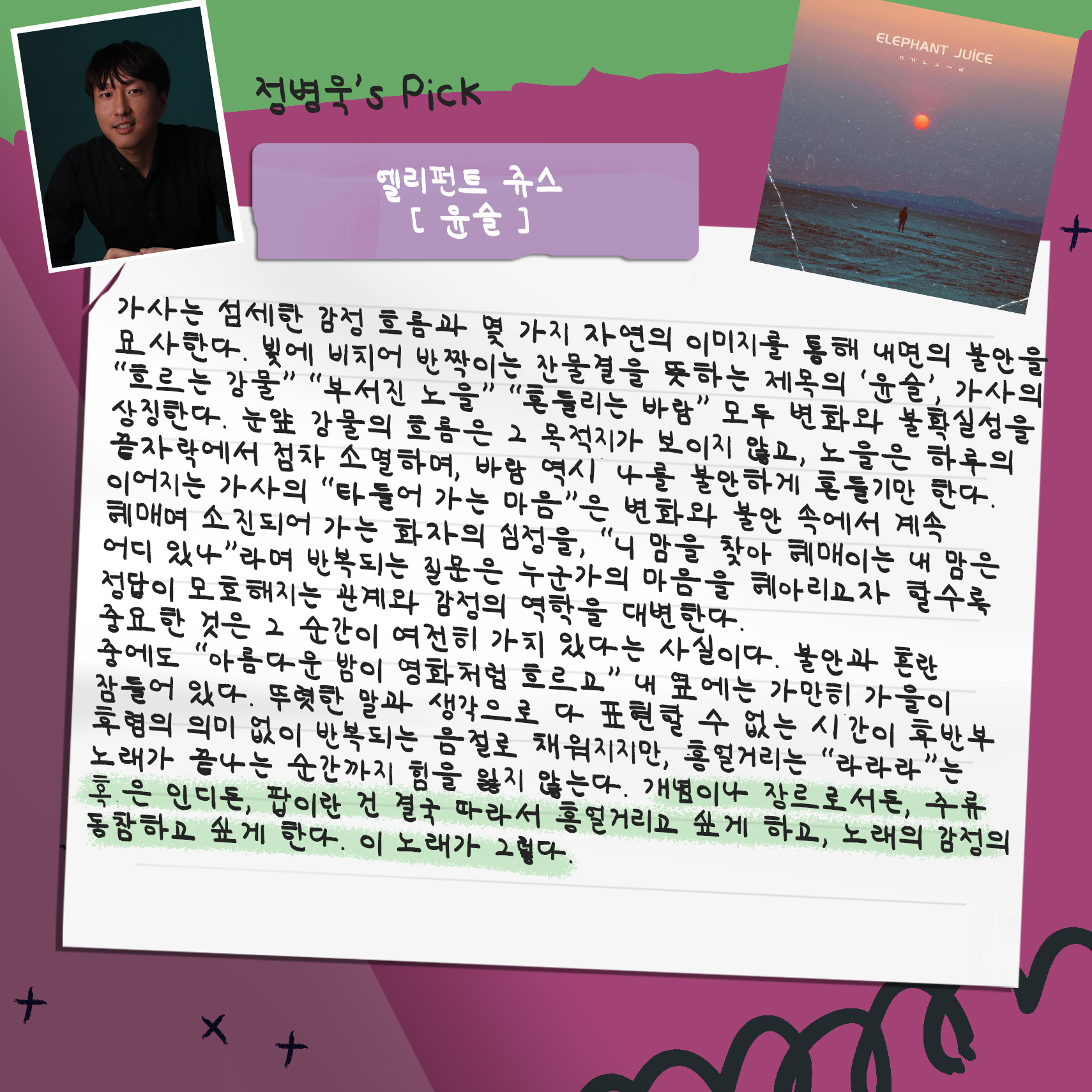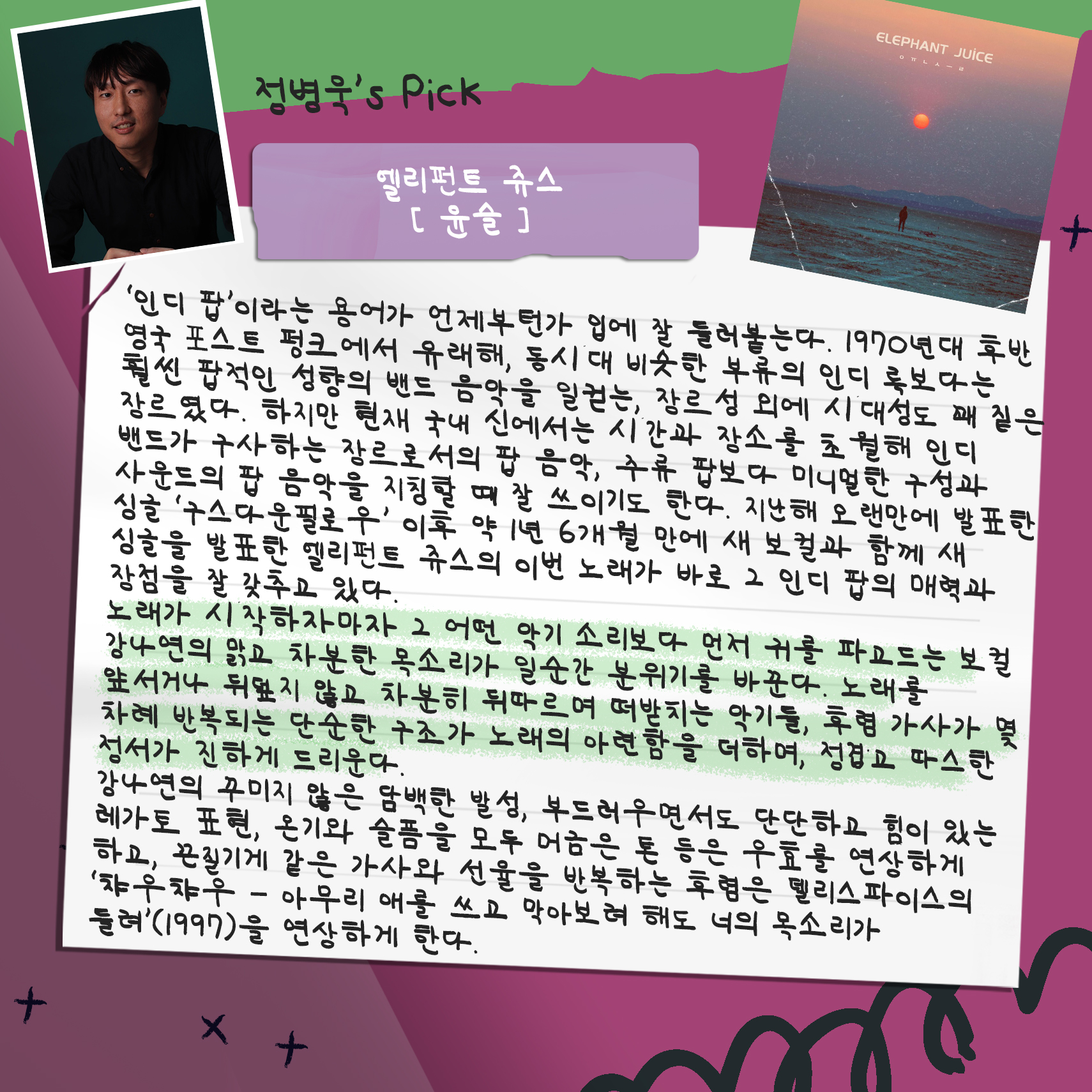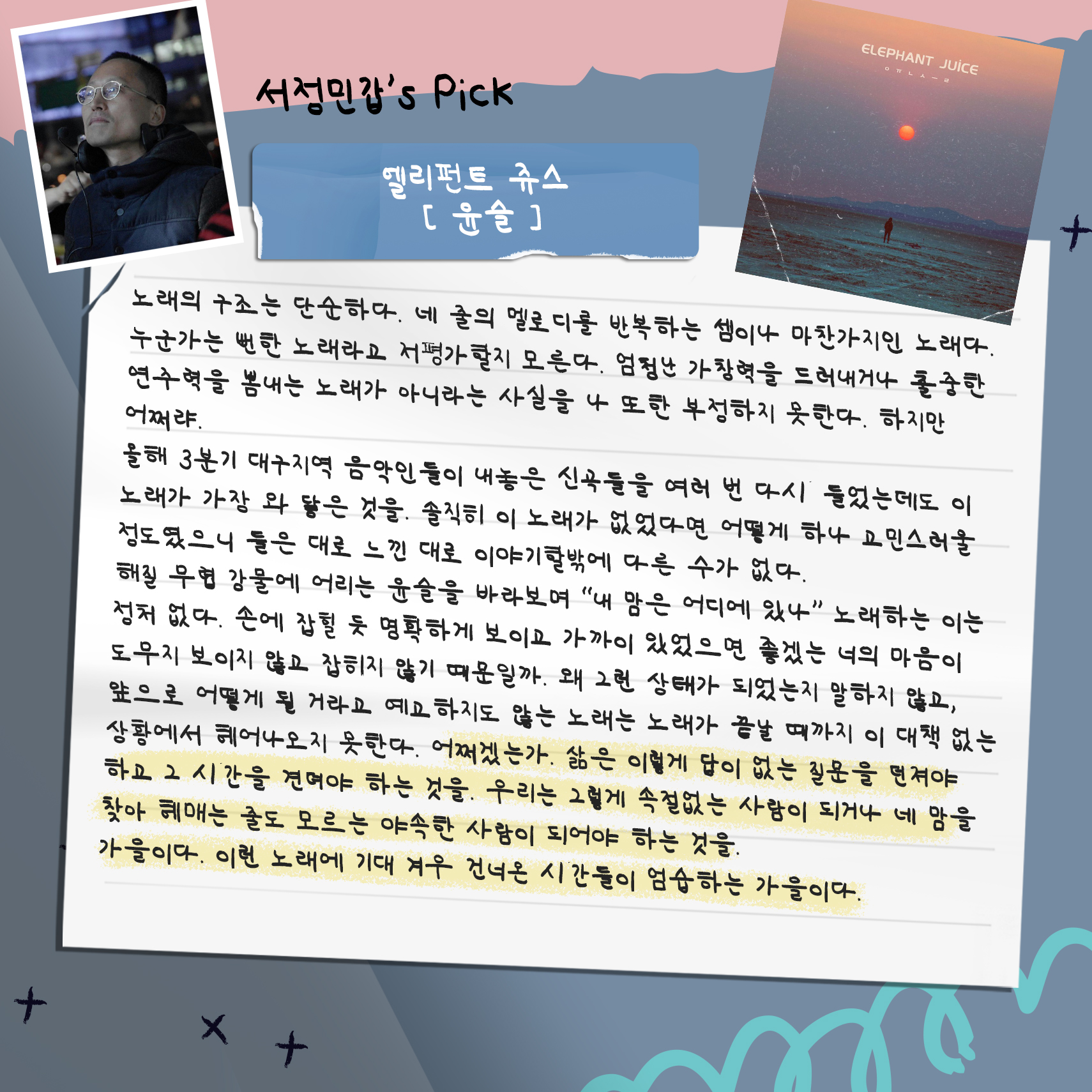 대중음악 의견가인 서정민갑 님과, 평론가인 김윤하 님, 정병욱 님이 들어 보고 고른 추천곡들입니다.