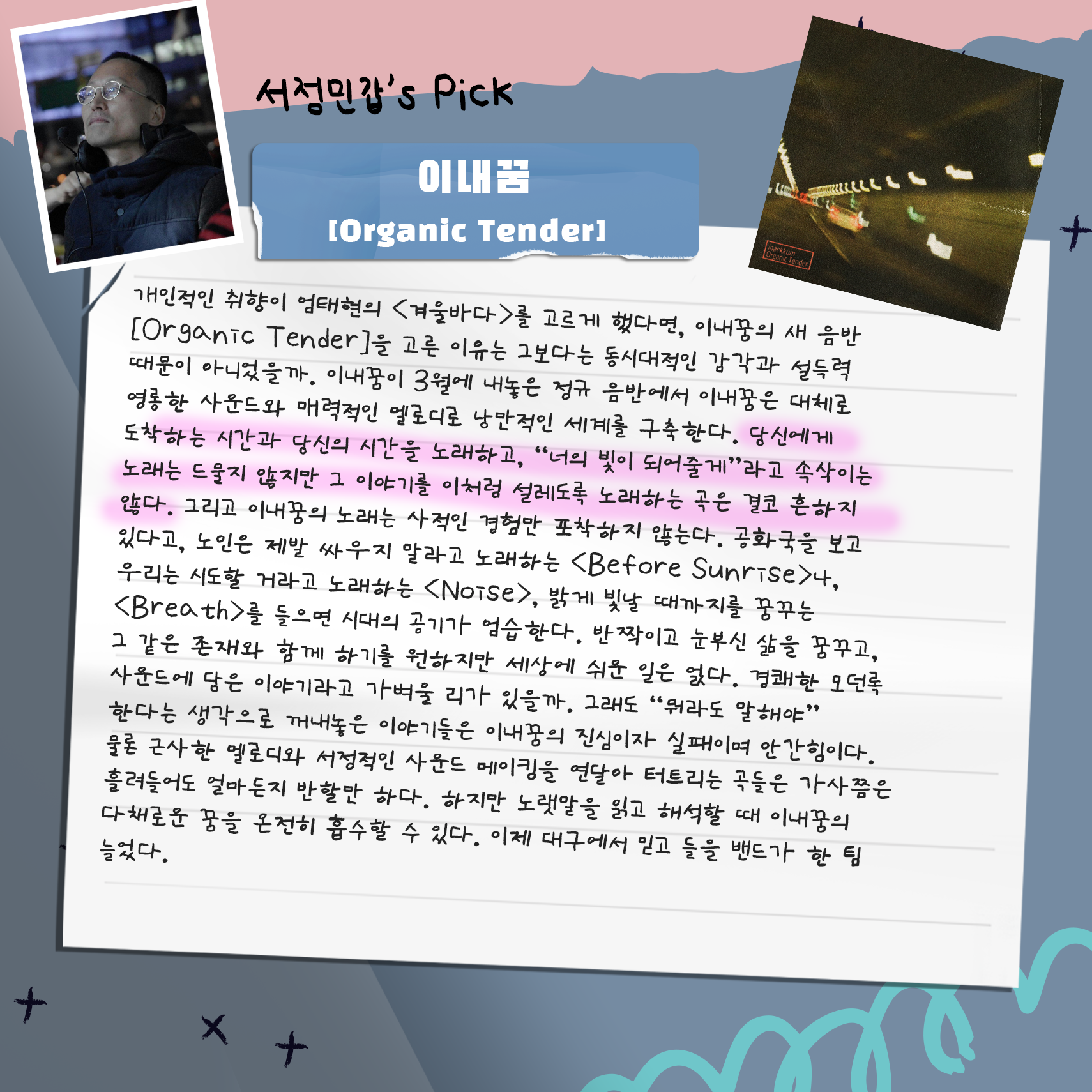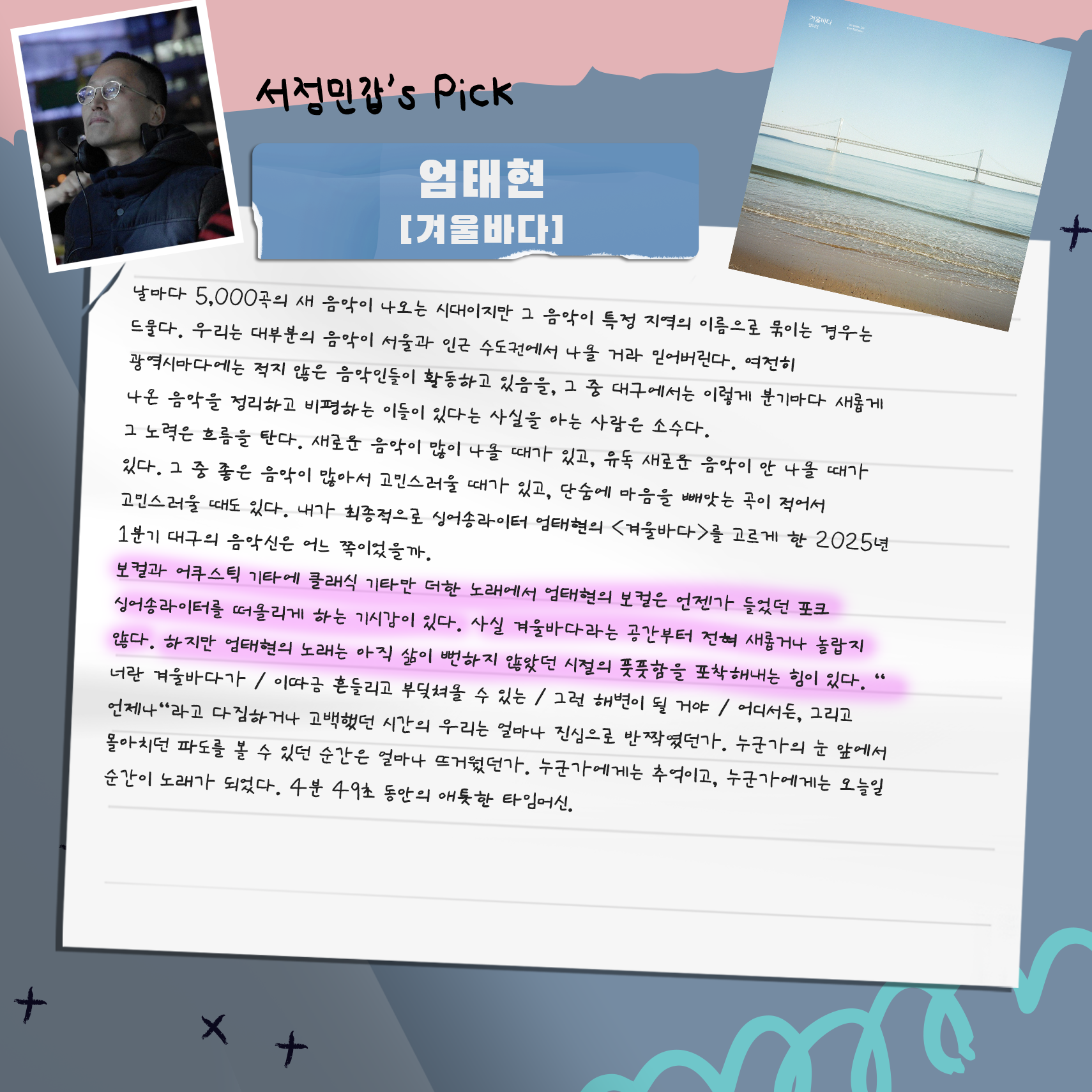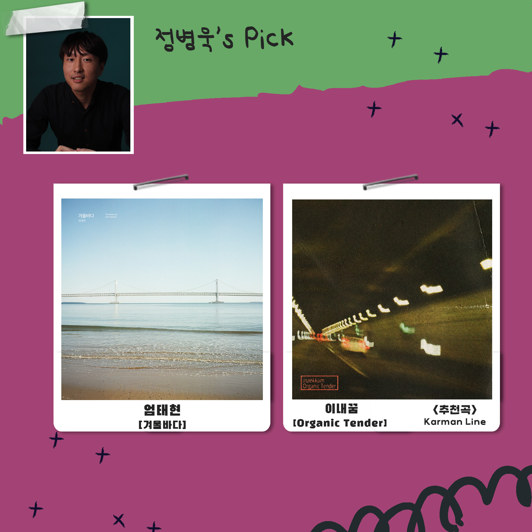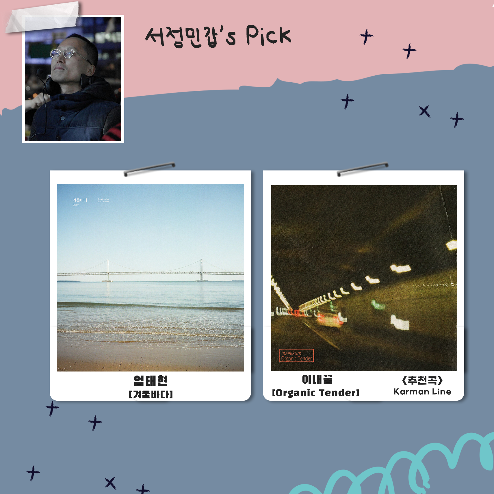 대중음악 의견가인 서정민갑 님과, 평론가인 김윤하 님, 정병욱 님이 들어 보고 고른 추천곡들입니다.