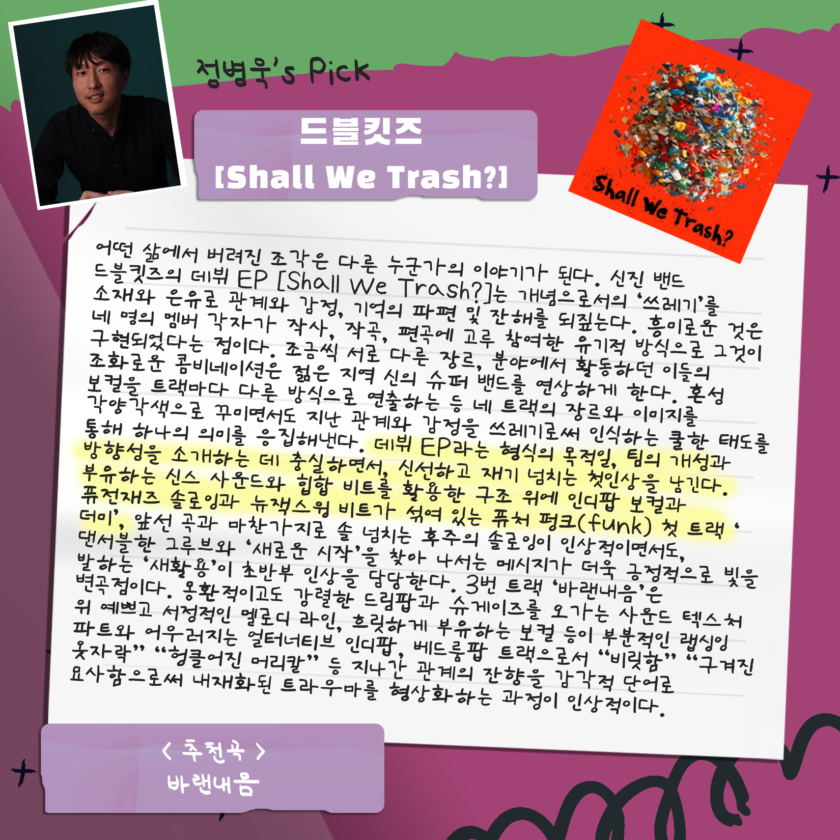 대중음악 의견가인 서정민갑 님과, 평론가인 김윤하 님, 정병욱 님이 들어 보고 고른 추천곡들입니다.